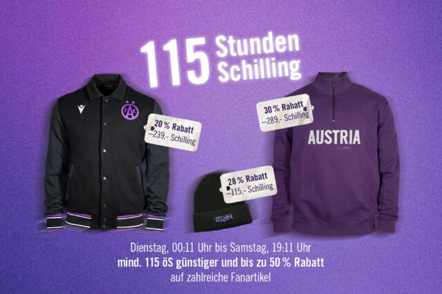 In Anlehnung an unser Gründungsjahr 1911 werden alle vergünstigten Fanartikel um mindestens 115 Schilling – rund acht Euro – reduziert, einige Produkte sogar um bis zu 50 Prozent.