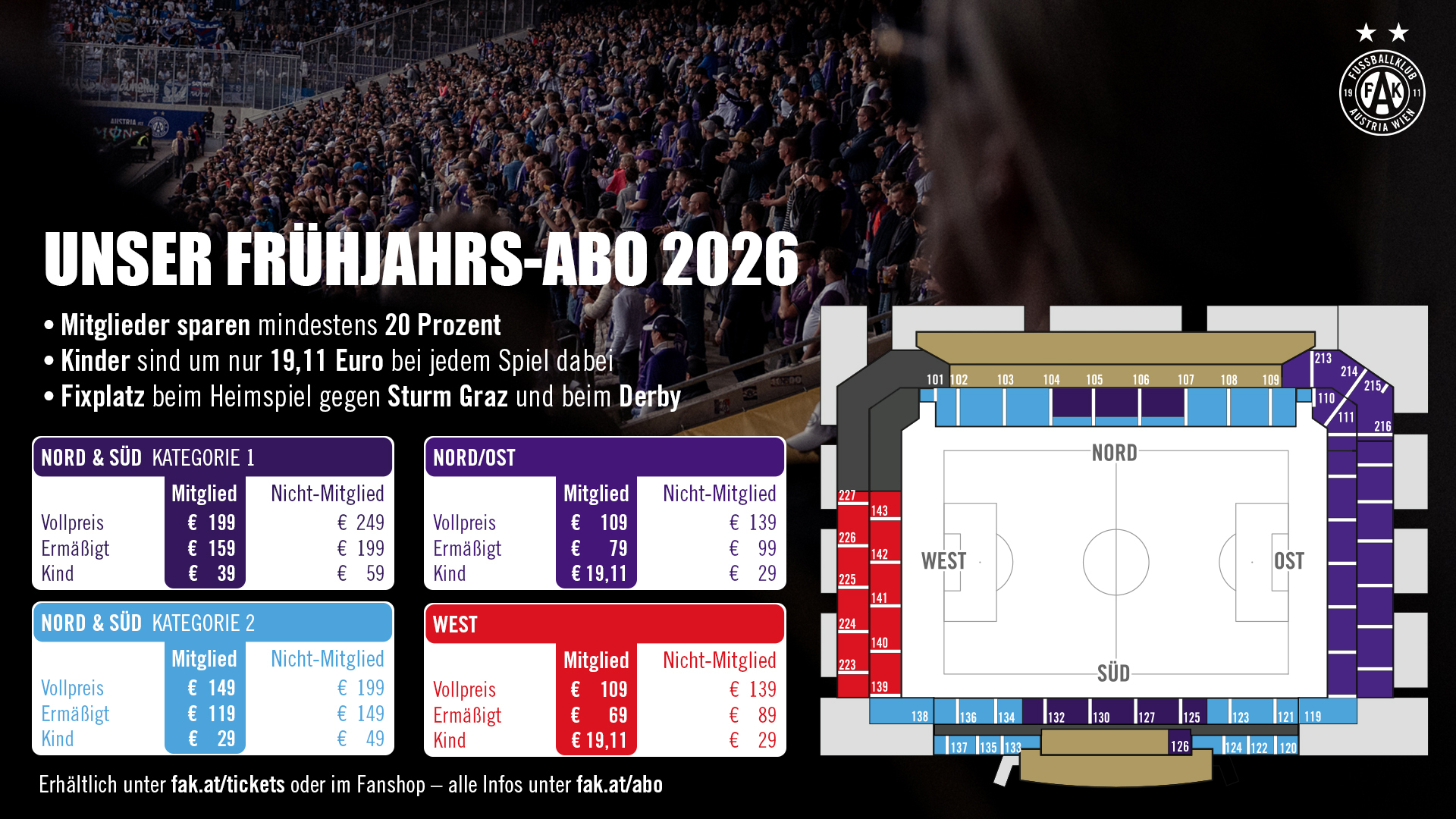 Bereits beim Heimspiel gegen Sturm Graz am 14. Dezember gilt unser Frühjahrs-Abo erstmalig. Aber nicht nur deshalb sind Frühjahrs-Abonnenten klar im Vorteil: Am 14. bzw. 15. Februar steht unser Heim-Derby in der Generali-Arena als erstes Heimspiel im Jahr 2026 am Programm. Dieses findet erstmals wieder mit beiden Fanlagern statt.